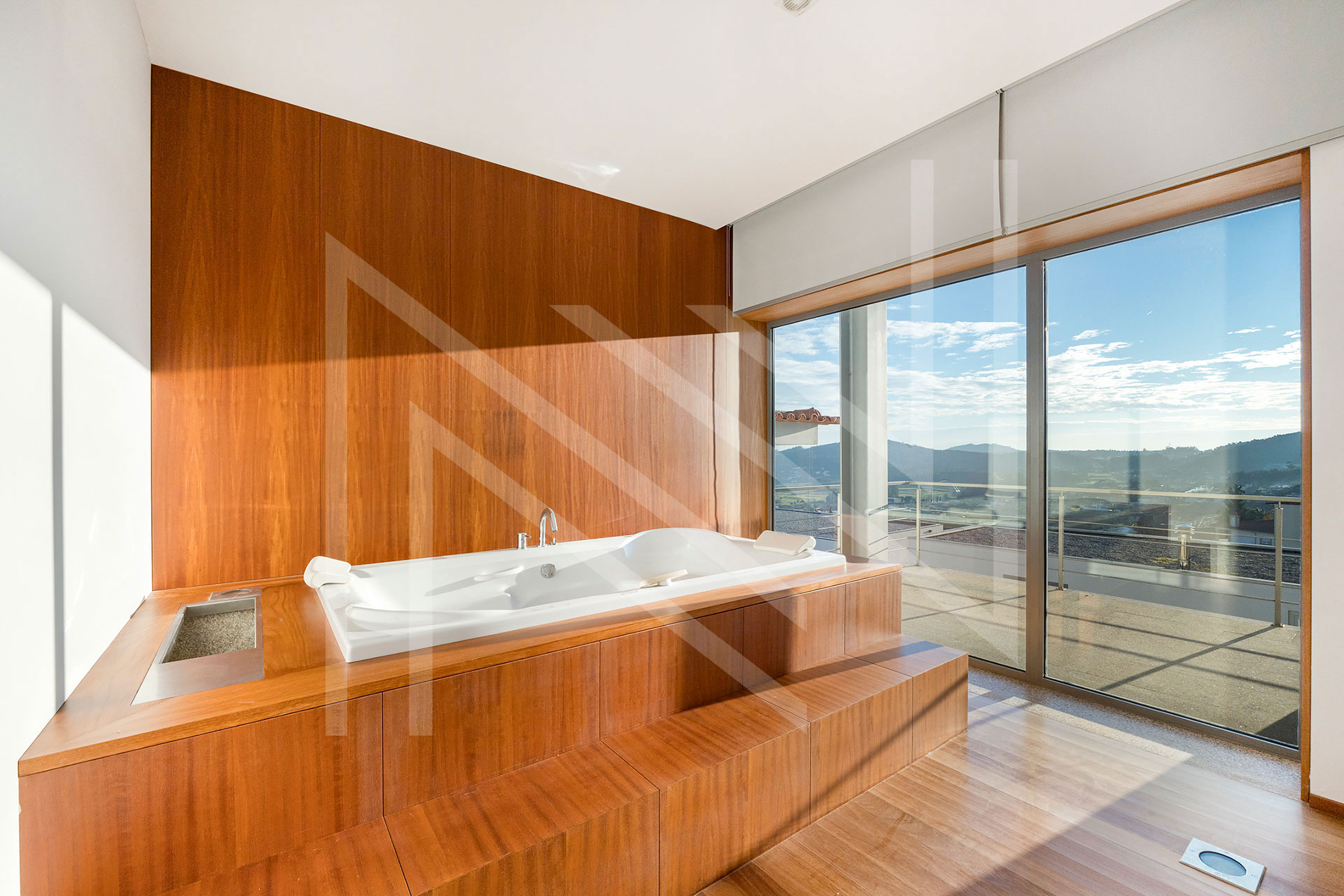 A moradia com vista desafogada para Braga, planícies e montanhas, é envolvida por um lindo jardim elaborado por um Arquiteto paisagístico, vedada por muros altos oferecendo maior privacidade e de cada lado da propriedade existem duas entradas com portões automáticos dando acesso às duas entradas da moradia. Caso exista interesse, pode ser construída uma piscina tanto no terraço como no próprio jardim (veja fotos com alguns exemplos possíveis de colocação da piscina).